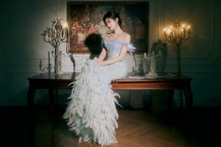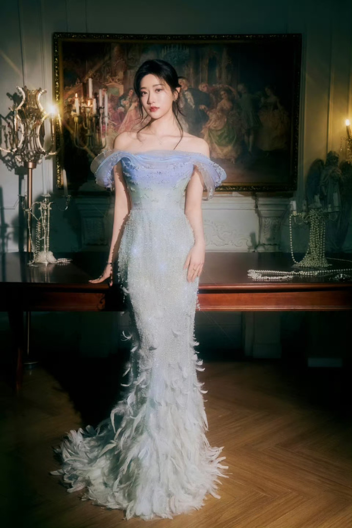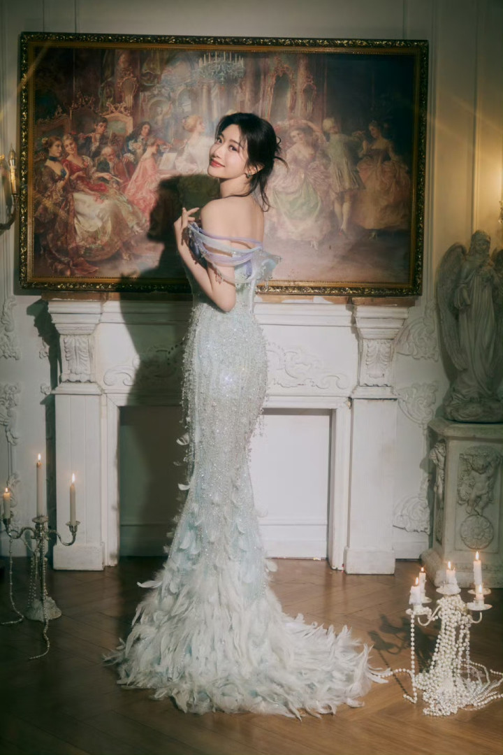 孙雪宁羽毛礼裙衬得身姿翩然如蝶